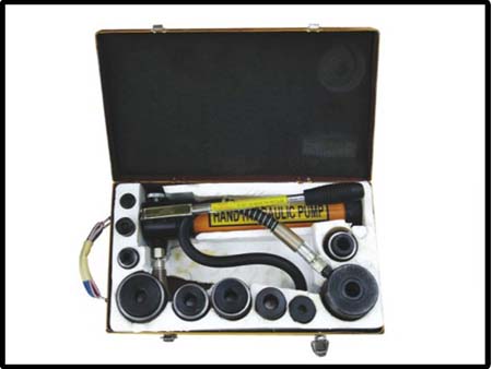 用途及性能:液壓開孔器,是一種能在4mm以下的金屬板 上開孔的先進手動液壓工具,能夠起到一般沖壓設備所不能 達到的開孔作用。其操作簡便、省力、速度快、加工面平整 光潔,也不受場地,位置限制均可使用,安全可靠。液壓開 孔器結構輕巧、美觀、易攜帶、可供冶金、石油、化工、電 子、電器、船舶、機械等行業安裝維修電線管道、指示燈、 儀表開關等的開孔,更適用于已成型的儀表面板底板,開關箱分線電器盒的壁面開孔之用。