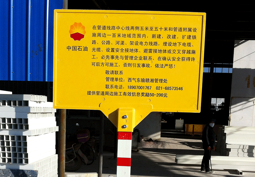 上圖為金能電力設(shè)備有限公司專(zhuān)門(mén)為中國(guó)石油天然氣股份有限公司西氣東輸工程制作的復(fù)合材料標(biāo)志牌。